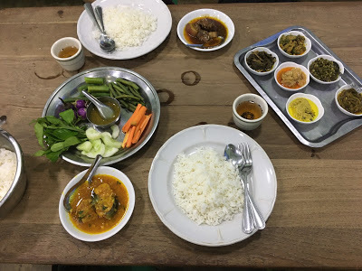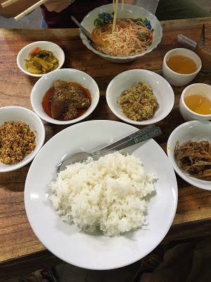 We had paid the Travel gods for our passage. Now it was time for food and sleep. After stowing our bags at the very modest and friendly guesthouse, we found the nearest open joint. It was wonderful to dig into a dinner of Myanmar curry with all of the side dishes. Then is was time for sleep before the next leg of our journey.