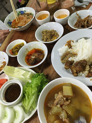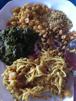 I had to rise from the table in order to capture everything in one photo. Besides the dishes mentioned above, there was a lovely soup and a big plate of green vege. This extravagant feast will usually cost about 3,000 kyat, or two dollars US.