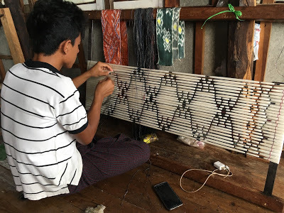 The weaving shops are a complete cottage industry. Using cotton, silk, or fiber obtained from the stem of lotus plants, workers create fabric with intricate patterns. Fiber is spun to thread, thread to yarn, the yarn is woven on foot-pedal looms, and all under one roof perched on stilts above the still waters of the lake.