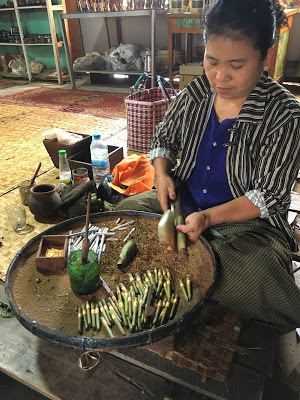 Burmese cheroots are a traditional smoke here in Myanmar. While they have been supplanted somewhat by ready-made cigarettes, there are still a great many local folks that favor these hand-rolled cigars. We departed the cigar factory, but not before I had a small bundle of cheroots tucked into my bag. If nothing else, the smoke they produce is good for chasing off mosquitoes. In truth, the cheroot is not as bad as all that, and my stock of cigars was running low. Besides, the sight of a Farrang smoking a traditional cheroot never fails to bring smiles and comments in the local tea-shop.