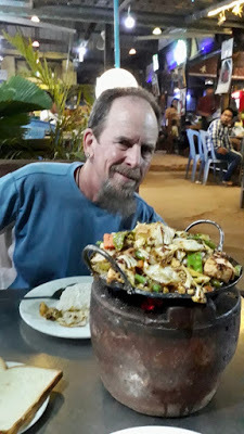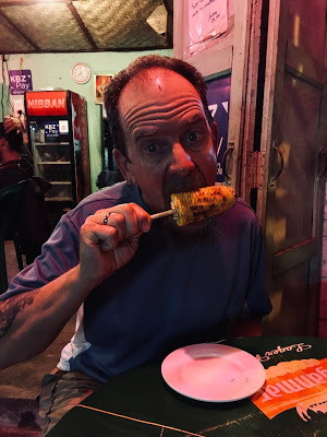 We found a night market that was clustered around the ruins of a pagoda complex. It was a maze of covered sandy walkways past brightly lit vendor stalls. Where there are vendors, there is food, because eating and shopping are a tag-team event in SE Asia.