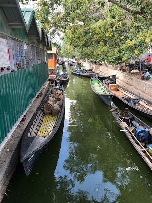 We were heading back towards the town now, and our pathway became a proper road. We could hear the unmuffled roar of long-tail boats plying the canal, caught glimpses of them between the buildings. The buildings seemed to be mostly warehouse structures. There were piles and piles of wooden crates stacked up in front of each of these buildings. We soon learned what the crates were for.