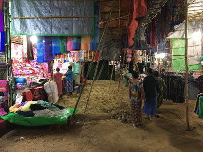 The night fell hard and black in a town where streetlights are few and far between. Armed with our trusty LED torch, we headed out to find some dinner. We were not disappointed. A typical Myanmar curry revolves around the rice. Accompanying the rice are a small dish of curry and a variety of savory side dishes. There are pickled things, spicy things, vegetable things, and dishes I cannot readily identify. Some are wonderful, some are strange, and the side dishes seem to change each day and at each curry joint. The assortment you see in the photo above was only a part of the meal. Before I could tuck in, more dishes arrived.