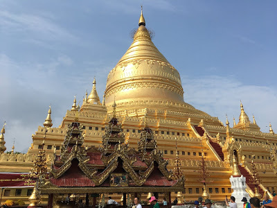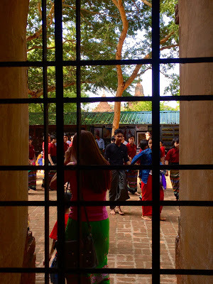 Shwezigon Pagoda is not a ruined old stack of stones. This pagoda was completed circa 1100 CE, and has been in use more or less ever since. It was very much in use as we walked the long entrance passage that led to the pagoda. The lunar cycle plays an important role in Buddhist rituals, and this week's full-moon had brought pilgrims from far and wide.