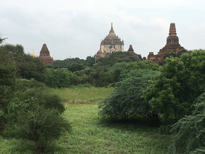The Bagan Plain, where one is never out of sight of a pagoda. Three ruined chedi and a Gu-Style temple hover above the sultry green.