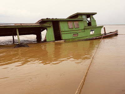 Our boatman steered the long-tail away from the lake and up a winding, muddy river. This was pure joy; the roar of the engine against the current, the jungle pressing in on both banks. The boat shot over bamboo weirs as we climbed the current, with the boatman raising the prop just enough to clear the weir. The narrow boar would hesitate against the current as we scraped over the weir, then plunge ahead as our pilot lowered the spinning prop back into the muddy water.