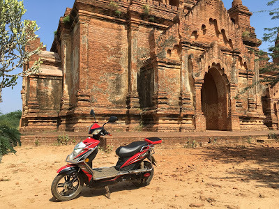 The Bagan Archeological Zone is spread out over a mostly flat plain that is over one hundred square kilometers in size. Outside of the ruined walls of Old Bagan, this UNESCO World Heritage Site is far too bit to explore on foot. Thus we found ourselves aboard what the locals call an E-Bike. It is a funny little means of transportation, a melding of E-Bike and scooter. They are for rent all over Nyaung U, costing 10,000 kyat per day. That works out to about $6.50, give or take.