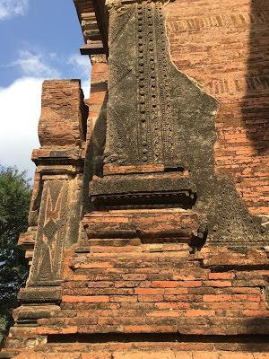 The Gu-style temples, like the chedi and pagodas, were built from stone blocks, often overlaid with brick. The brick was used to to build up the shape of the temple walls, and to fill the spaces between the sections of carved stone façade. The brick was then clad with limestone or sandstone. Most of this cladding has fallen away. It is particularly vulnerable to the many earthquakes that rattle this region. The bits of cladding that remain are stained a dark grey-brown. They still bear the mark of the maker's hands. The intricate geometric patterns and designs must have been an amazing sight when these temples were gleaming white above the green fields.