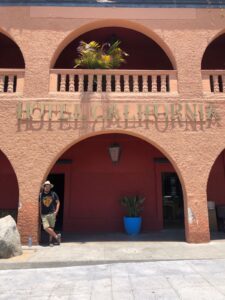 Aquí no acaba la aventura. Pues a unos cuarenta kilómetros se llega al Pueblo Mágico de Todos Santos. En un principio famoso por su Hotel California. Un encantador y peculiar sitio. Tan fresa como San Miguel de Allende y tan tranquilo como Valladolid. Alrededor del centro podemos encontrar en sus banquetas vegetación de la región adornando sus calles para placer visual de sus visitantes. Joyerías, talleres de artistas y mercados de finas artesanías le dotan de una variedad cultural que hace querer a uno venir a escribir un nuevo libro. Buscando en sitios web no pude encontrar un alojamiento por menos de mil pesos la noche. Así que decidí aventurarme esperando tener un poco de suerte; el cielo nos sonrió esa tarde, pues encontramos un hotelito con piscina en quinientos pesos la noche a menos de una cuadra del California. Hay que ir a contemplar los atardeceres a Playa Lobos y Cerritos que son un cuadro de nostalgia ante la belleza de la creación.