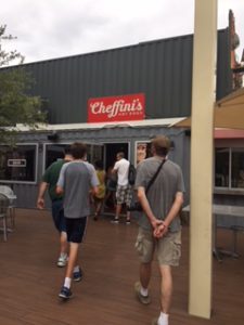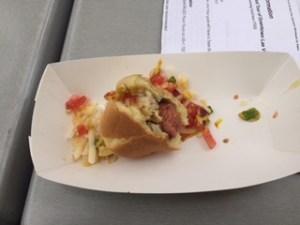 After a quick tour of the park, we stopped at Cheffini’s and Pinches Tacos. We were served the Cheffini dog and Mexican street corn and Agua Fresca. My favorite thing on this stop was some type of milk with cinnamon in it that the kids were served.
