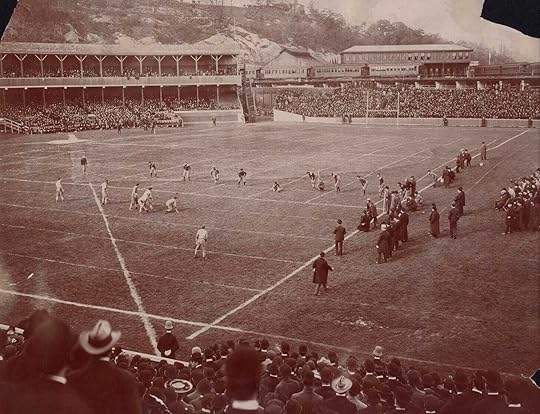 Brown or sepia-toned football images take us back to the late 1890s and early 1900s. The images are often team photos that appear warm and inviting, in part because they lack the sharp contrasts of black-and-white photographs. Among my favorite sepias is the image of Penn and Columbia at the Polo Grounds in 1903. Taken during the only season when football used the partial checkerboard field, one team attempts a free kick as the subway passes on the overhead track in the background.