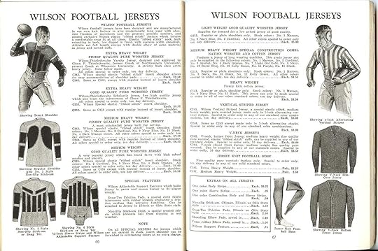 Wilson Sporting Goods began in 1914, intending to profit from selling the byproducts of slaughterhouses. They mostly sold strings for tennis racquets and violins, surgical sutures, and baseball shoes. In 1915, they acquired a knitting mill to produce athletic uniforms. My earliest Wilson catalog is from 1928, when their jerseys were adorned with friction strips or vertical stripes similar to those officials were beginning to wear.