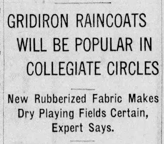 (Green Bay Press-Gazette, April 26, 1926)I initially assumed the article concerned the sideline gear worn on rainy or cold days, but a quick scan revealed the rainco...