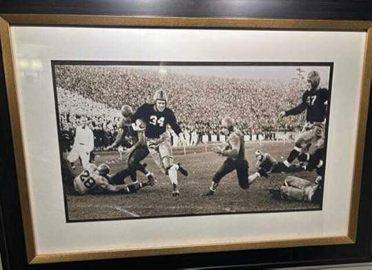 Logos on the side of helmets have been the norm since Fred Gehrke painted horns on the Los Angeles Rams' helmets in 1948, but logos on the front and back of helmets preceded the Rams' horns. The University of Chicago had their Wishbone C on the back of their helmets in 1921 and 1922. Logos on the back never became popular, though we'll see below that two other Big Ten teams had them about forty years later.