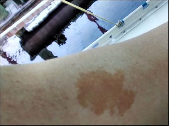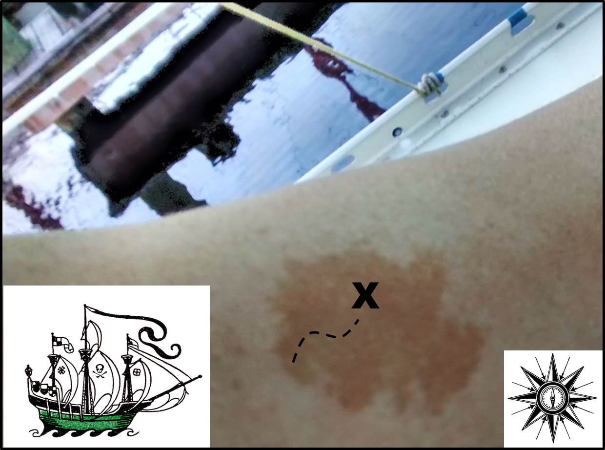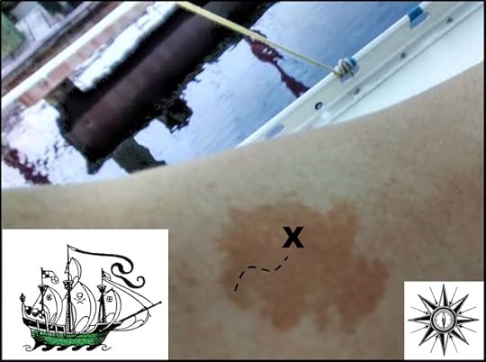 I told my dock neighbor my theory. "One of these days, when Scott and I are out sailing, we're going to find the island that matches my birthmark and we're going to lay claim! The birthmark proves its mine!" He chuckled and said that what would make it even better was if we found buried treasure on our island. Then he had brilliant idea - get a tattoo for X marks the spot on my birthmark.