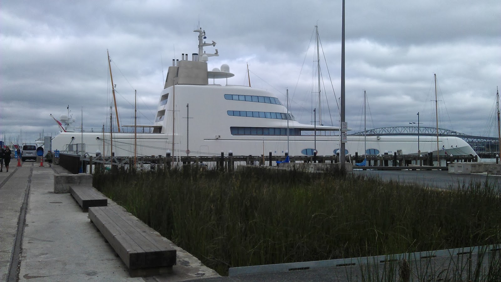 Silo Park marina is where the mega-yachts berth. This ridiculous boat, the A, is owned by a Russian tycoon and worth $350 million. He has brought it into Auckland to be repainted. It is going to cost around NZ$30 million alone to repaint and take approx. 18 months.
