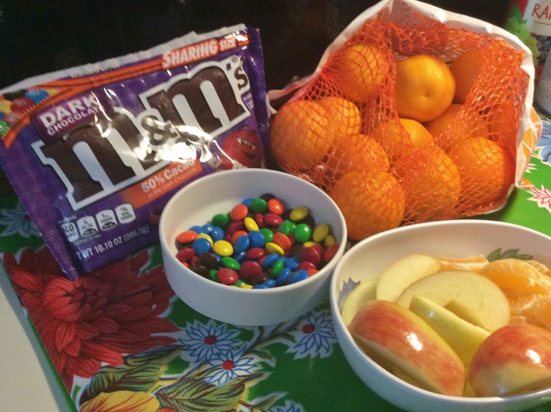 Checking sales reports and working on spreadsheets was tiring work. Snacks were required. Which bowl do you think was finished first - the one with M&M'S or the one with fruit?