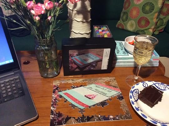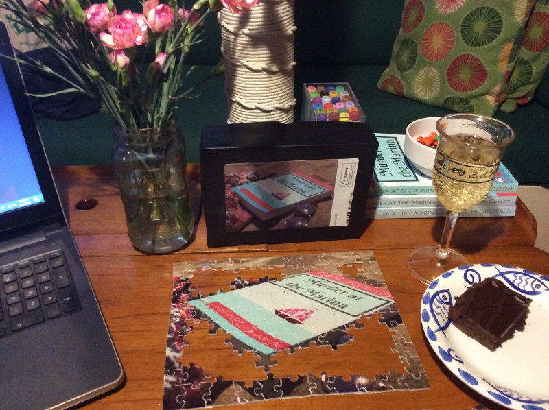 The day finally wrapped up with some bubbles and brownies. If you've read Murder at the Marina, you'll understand why I had brownies. While I got my chocolate fix, I put together a puzzle my mom sent me. Yep, that's my book cover. She's the best mom ever, which is why I dedicated my book to her.