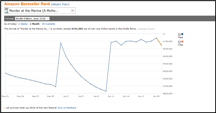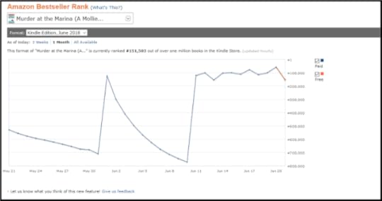 If you're interested, the ranking of the ebook edition at 2:00 PM was 151,503 compared to 56,049 the previous day and 27,028 when I first put Murder at the Marina up for pre-order. I'm not really sure how the mysteries of Amazon's algorithms work, but I do enjoy looking at graphs.