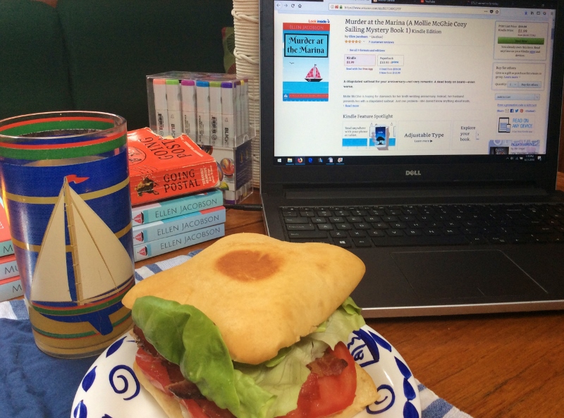 Lunchtime! A BLT because nothing goes better with a book release than bacon accompanied by a glass of sparkling water with a splash of mango juice. Okay, maybe there were some M&M'S too. Over lunch, I checked out the reviews people have been leaving on Amazon and Goodreads. I was blown away by how many folks took the time to read and review Murder at the Marina.
