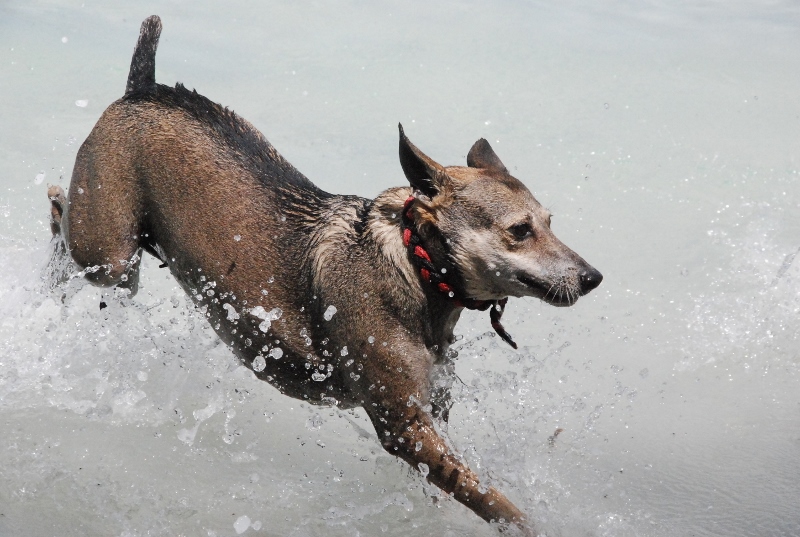 Well, she didn’t. In fact, water terrified her. I, who had grown up in Mexico with dogs that jumped into the pool at the first opportunity, now lived surrounded by gorgeous beaches with a dog that refused to set foot in water, be it ocean or lagoon. She even skirted puddles (ever so daintily).