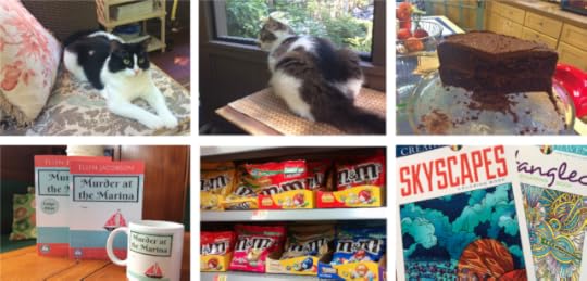 Clockwise from upper left - six things that start with "C": (1) cat; (2) another cat; (3) chocolate cake; (4) coloring books; (5) candy; and (6) coffee mug.It's time for the usual monthly recap in numbers. If you're a regular visitor over here, then you can probably guess what the primary focus was during June and I bet you're tired of hearing about it. Yes, it was all about the release of Murder at the Marina. After a whirlwind trip to Atlanta at the beginning of the month, I spent the rest of June getting everything organized for the release and then managing all of the activity that comes with a book launch. I also worked on the next book in the series, Bodies in the Boatyard, although not as much as I would have liked.