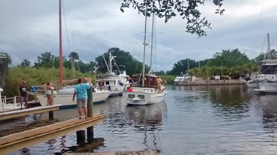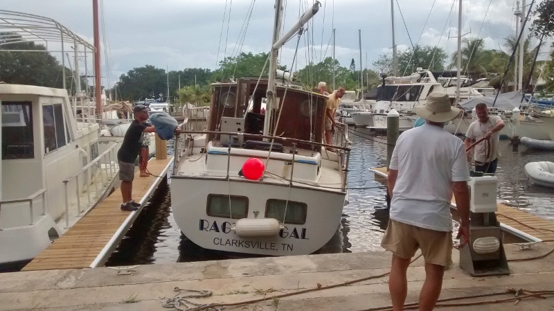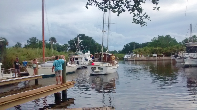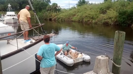 There's no rest for the weary. After dinner, it was time to move Ragtime Gal from the face dock over to their slip. This involved pulling it from one side of the marina to the other with a very long line. Oh, yeah, did I mention that the engine isn't working? Guess, Ted and Sandy's boat projects aren't done yet.
