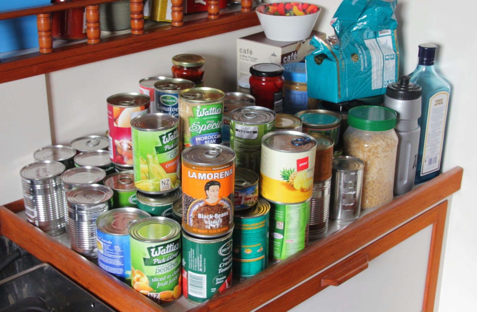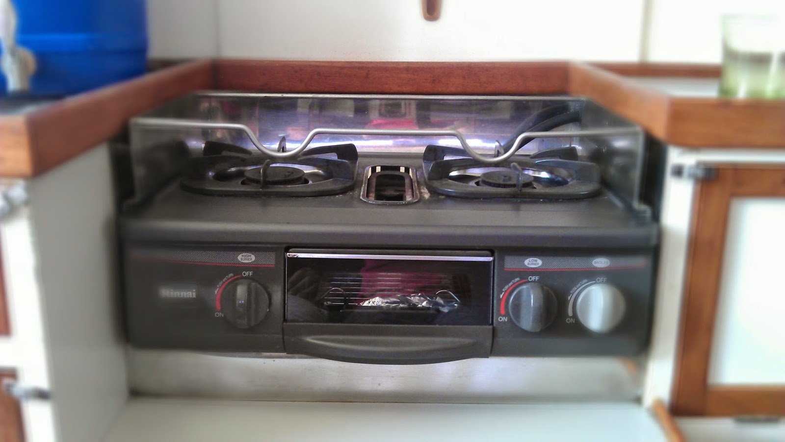 4 - Now I'm thinking about cooking in New Zealand. That's how random my thought process is. That's a picture of our stove on our boat in New Zealand. No oven, although it did have a broiler which was handy for garlic toast. The other picture is of our provisions for one of our cruises. You'll note the Bombay Sapphire Gin (courtesy of duty-free at the airport) next to the coffee. Both indispensable items.