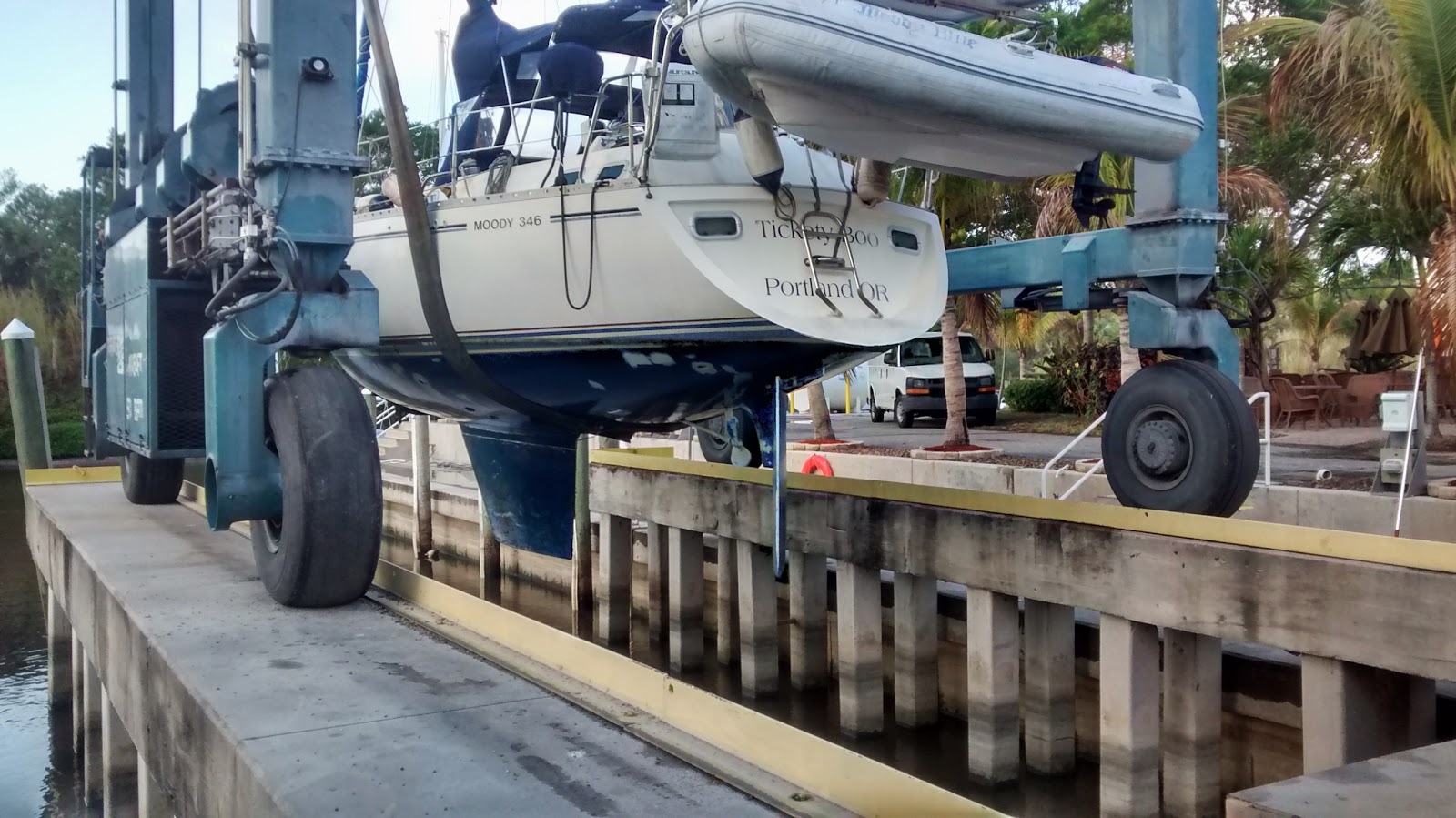 2 - For bigger boats, you use a Travelift. It has slings that lower into the water, cradling your boat, then lifting it out.