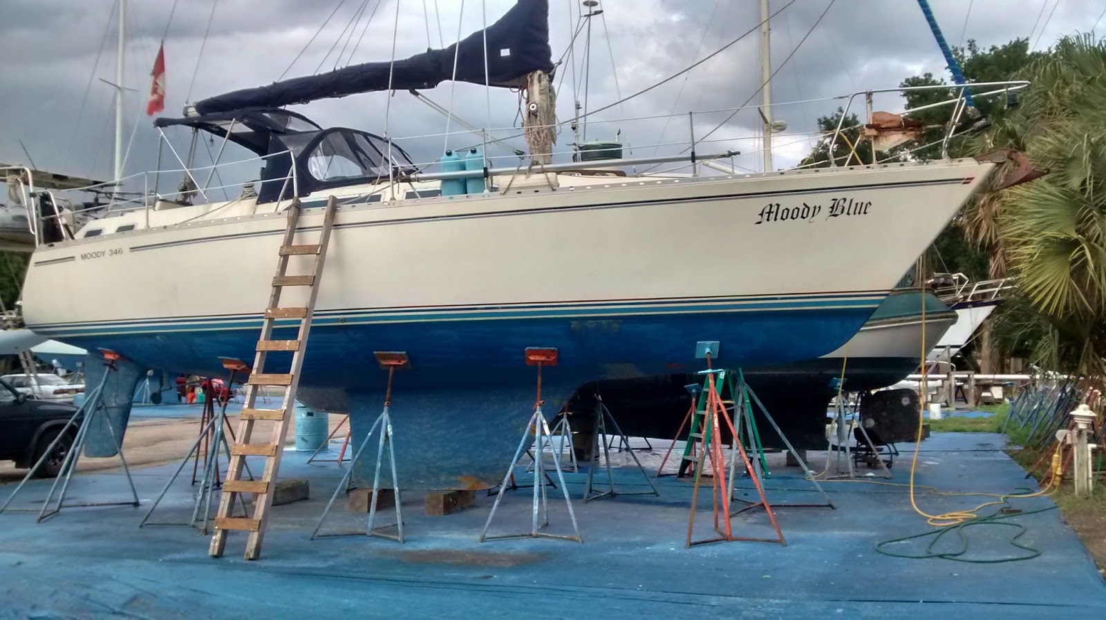 3 - This is a picture of our boat after we bought her - you can see the blue paint which has to be sanded down before you can put on anti-foul paint.