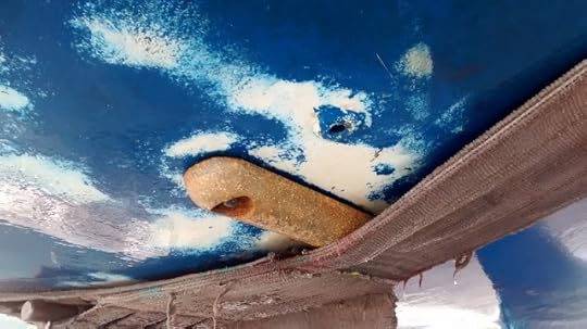 2 - The last time we did our bottom paint, I tried sanding the rudder. The electric sander weighs a ton and the vibration your hands is unbelievable. Fortunately, Scott came to the rescue and finished the job.