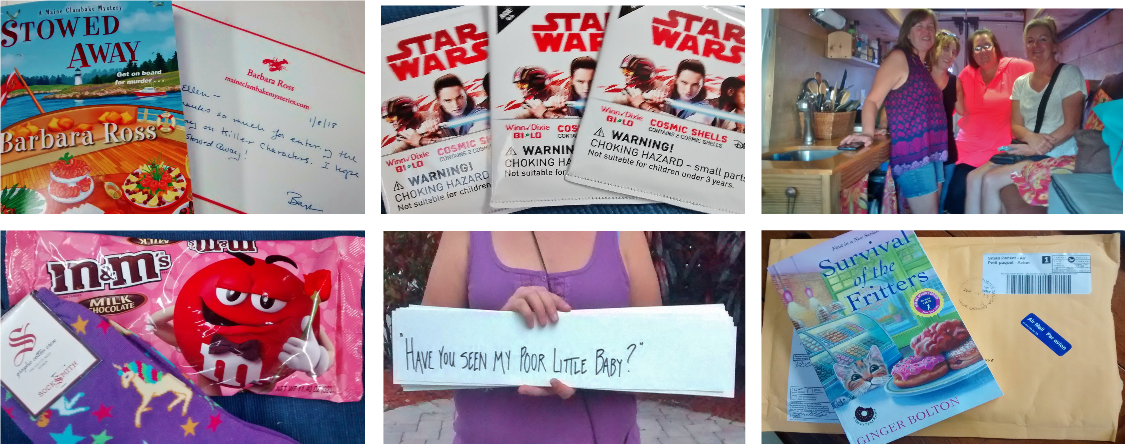 Clockwise from upper left: (1) One of the books I won; (2) Star Wars Cosmic Shells that some friends gifted me; (3) Van party!; (4) Another book that I won; (5) English translation for a Spanish song that was sung at one of the cruiser get-togethers; and (6) Gifts from my mother.It's time for our usual monthly recap by the numbers. January was chock-full of Indiantown Party Posse get-togethers (lots of fun and full of calories), saying goodbye to friends heading off on new adventures, and countless hours making final revisions before sending my cozy mystery, >>Murder at the Marina<<, off to the editor.