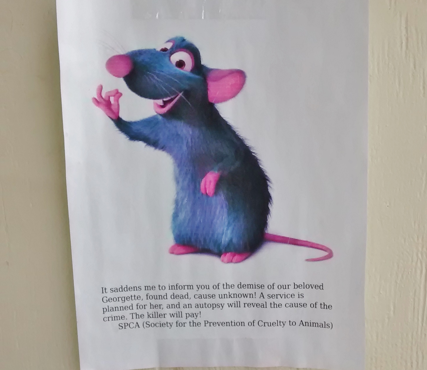 1 - One day, as I was walking past the free table at the marina, I noticed a sign with a picture of a rat on it. I took a closer look and saw that someone was bidding a sad farewell to their "beloved" rat.