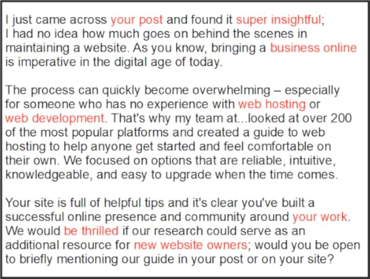 Next, she says that it was >>super insightful<<. Uh, okay. What exactly did she find insightful about it? It's just a page with a listing of blog posts. Did she find it insightful that I know how to insert hyperlinks? I think what was supposed to happen here is that I'd be so flattered that she called it *insightful* and put a *super* in front of it, that I would jump at the chance of doing her bidding.