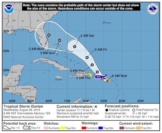 At the time of writing (Sunday afternoon), things are up in the air as to what Hurricane Dorian will do. We're still in the cone of uncertainty and are keeping a close eye on things. Hopefully, he turns northward and stays well off-shore. But even if he does, the winds and rains may be pretty damaging here resulting in us losing power and internet.