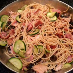 Add olives and cooked drained spaghetti to zucchini and bacon, tossing to mix.
