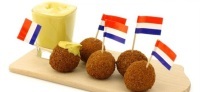 Bitterballen: Translated as bitter balls When you go for drinks or visit a birthday party it is most likely that these little, round, often dangerously hot snacks are served. They are battered in a crunchy breadcrumb coating and filled with a gooey mixture of chopped beef, beef broth, flour, butter, herbs and spices. They are typically served with mustard for dipping. The red-white-and-blue flag is also nearly mandatory while serving them!