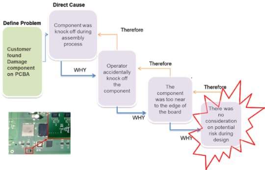 From the figure above, it seems that the manufacturing cause is the cause of the component damage when we deep dive the root cause is pointed to the design issue where the component is designed too near to the edge of the board and cause handling damage.
