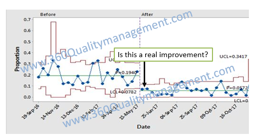 In relation to our above question, we will need to compare before and after improvement plan data to validate if there is real improvement. This mean we will need to check if there is any real shift either in variation or mean of the process.