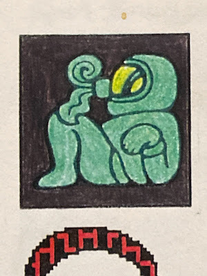 Okay, it probably wasn’t a countercultural Von Dänikenism. The text says it’s god GII, of the Palenque Triad. The smoke could be the pre-Columbian visual shorthand for speech. The figure in the lounging position used to fit it into the glyph could be dressed to play the sacred ball game. It could be a talking ballplayer, or a depiction of a mask with a built-in megaphone-like device, similar to those used by actors in ancient Greece?