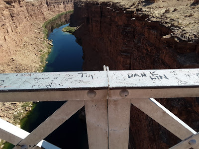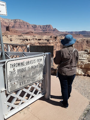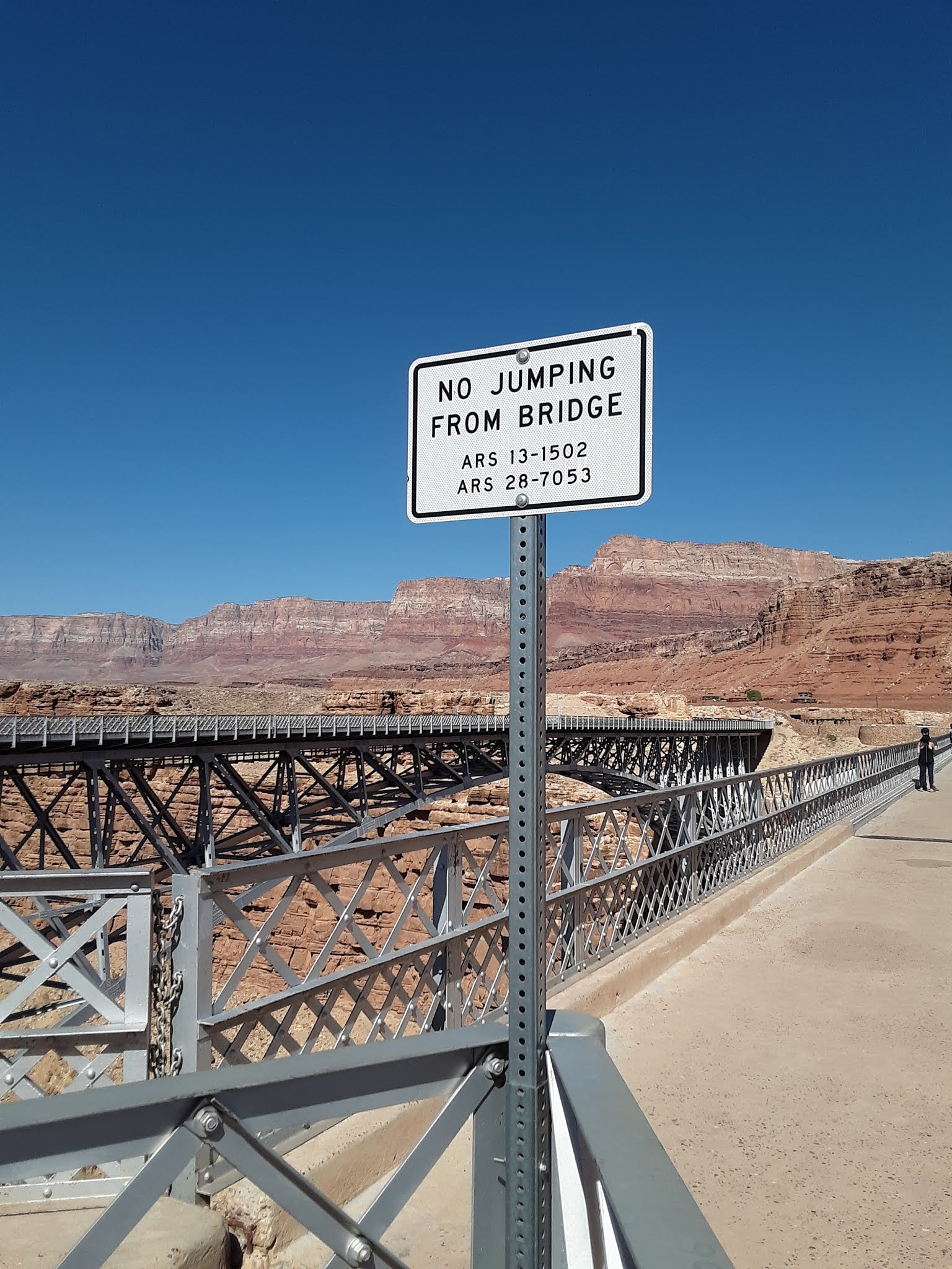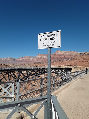 Soon we were on the 89, going through the Navajo Nation, which is still locked down after taking a heavy toll from COVID-19. A sign announced a NO DRONE ZONE. We stopped and took pictures at the Navajo Bridge over the Colorado River, where they are concerned about people jumping off or throwing objects.