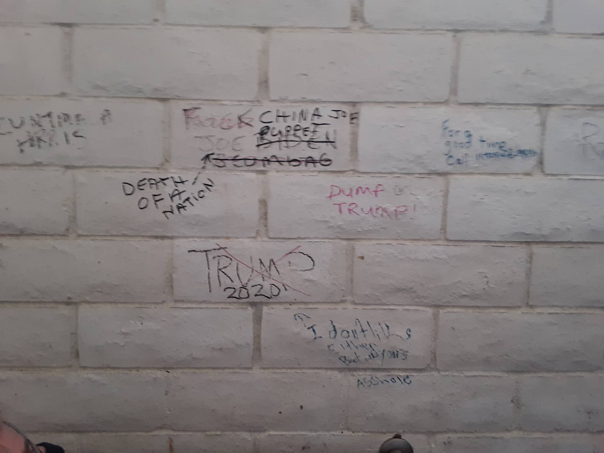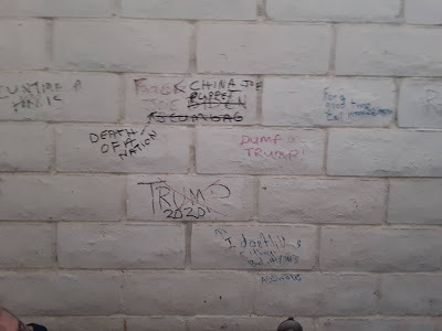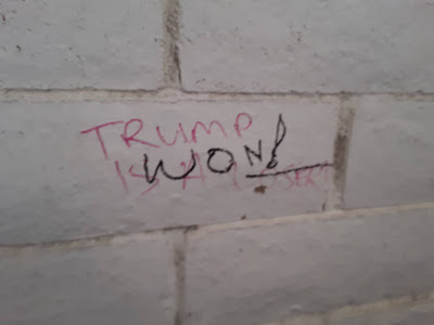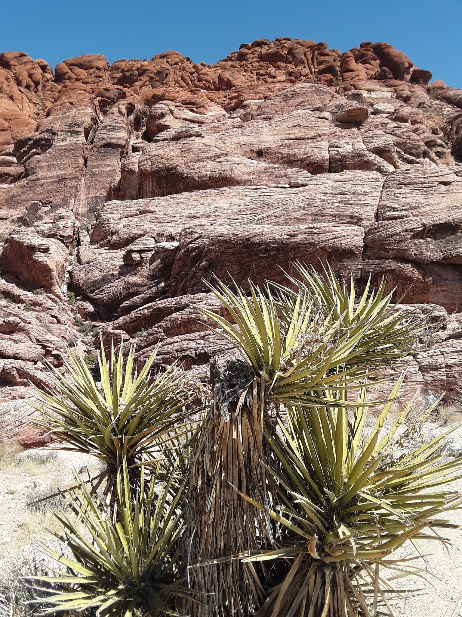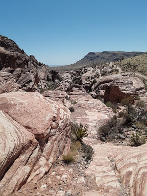 The manicured theme park look eventually gives way to a ticky-tacky dystopian overgrowth that thins out into desert and the spectacular geology of Red Rock Canyon, where we did a pit stop at a scenic view area. Emily caught a guy taking a selfie in the gender neutral restroom, where there was political graffiti disputing the recent election.