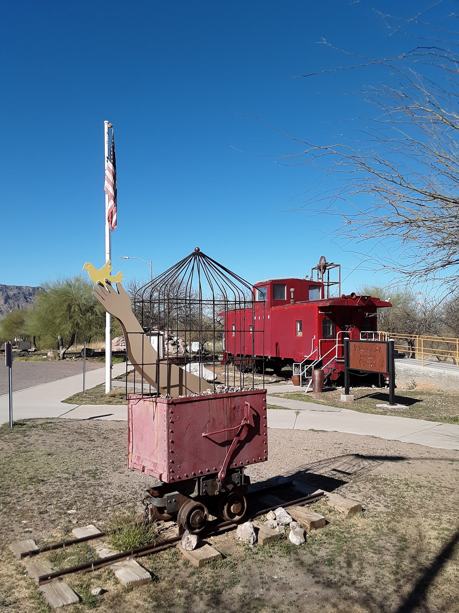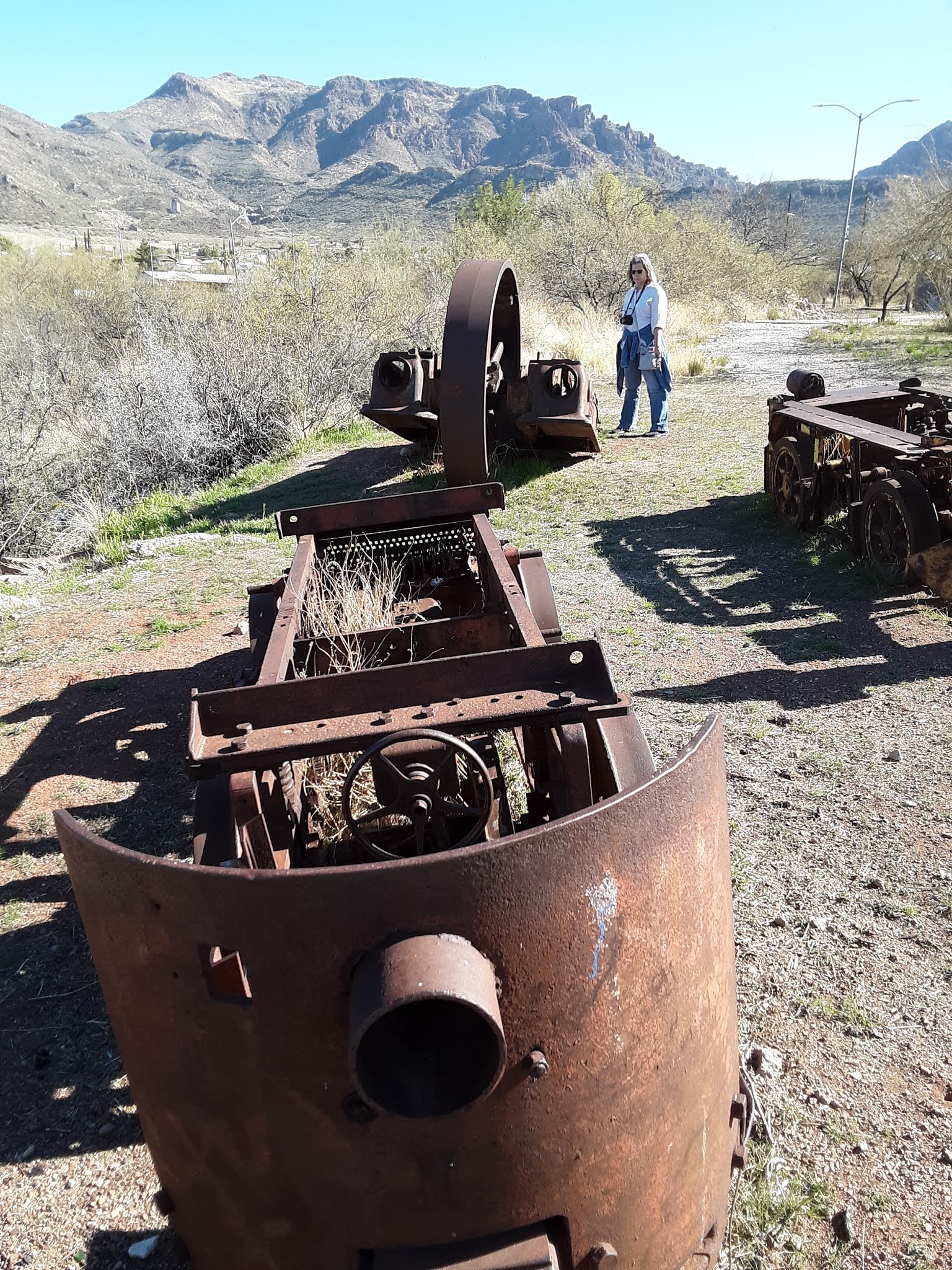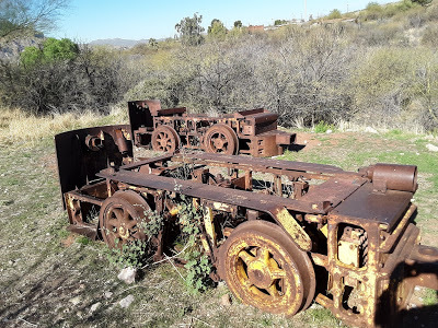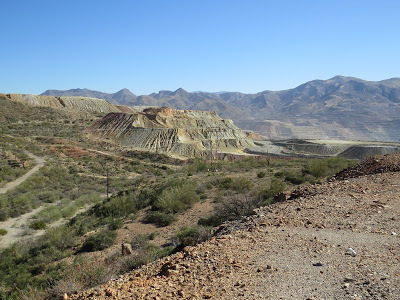 We took Grand Ave. out to the 60, past the Superstition Mountains, and Apache Junction, through the desert, into more mountains, to a town called Superior. There it got surreal . . . Lots of abandoned motels, middle-aged/middle class bikers and their shiny machines all over, plus old, rusty mining equipment on display. Magma Avenue! A monument to fallen miners makes it even more surreal . . .