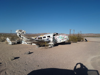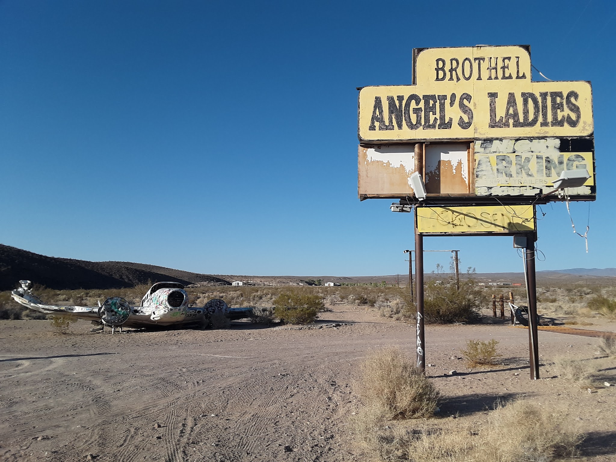 After more wide open spaces populated by wild donkeys, and towns that were like low-rent versions of Tonapah, near Beatty, we came across the battered sign from the abandoned Angel’s Ladies Brothel, next to which was a crashed plane, stripped of its engines and covered in graffiti.