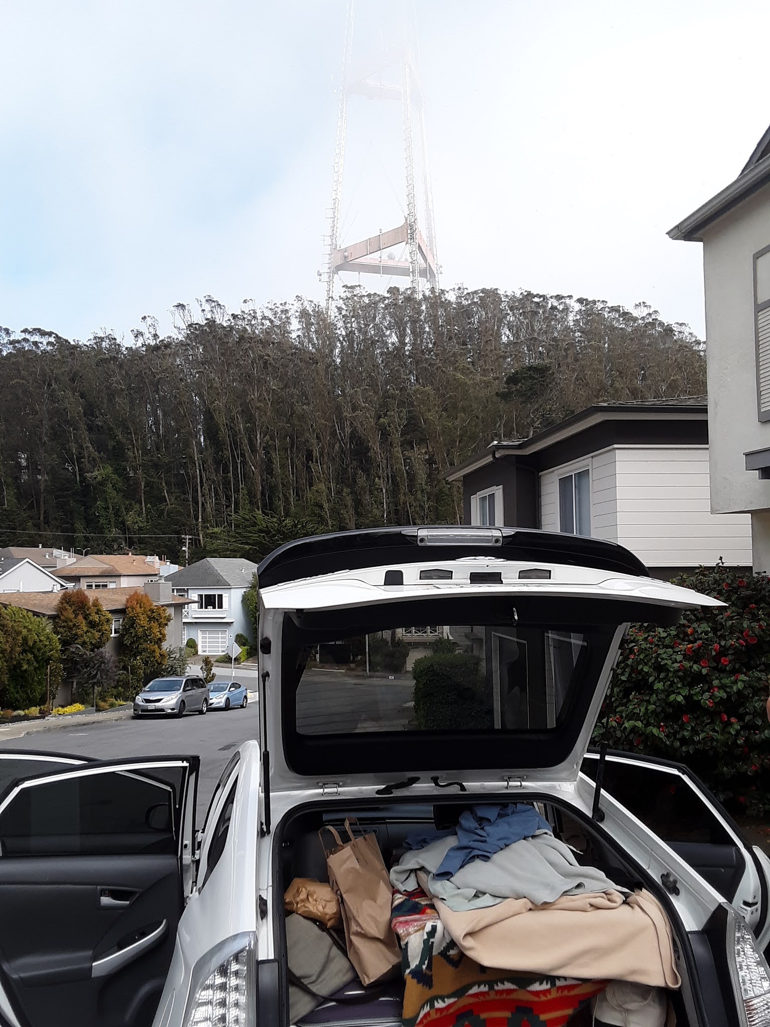Then it was across the Golden Gate Bridge to San Francisco for the business reason for the trip: Mike had to deliver a large, combination coffeetable/drum to a client. The guy’s apartment was on a steep hill, as is most of SF, and next to a huge TV broadcast tower that penetrated the overhead clouds. This city is always something different.