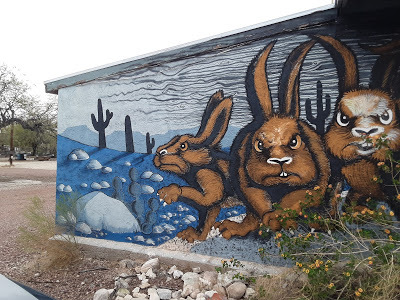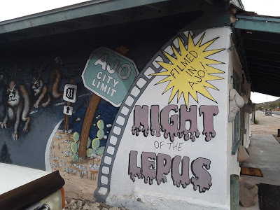 In Ajo, a charming town whose major industry seems to be Mexican auto insurance, we spotted a mural with angry-looking giant rabbits. Turns out the classic schlock sci-fi flick Night of the Lepus was filmed there, and Roadrunner Inn bears a mural in its honor. They also sell donuts and espresso.