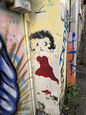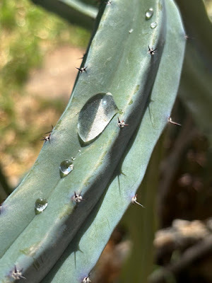 It happens to me all the time, like the other day, it had stopped raining, while making my way to my troque to go to work, I had just taken a picture of the glittering drops on a cactus when I noticed, a few door down, a young brown woman in a white bathing suit. This wouldn’t be unusual in the killing heat of the summer, but it was cold. And she was soaking herself down with a garden hose.