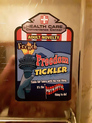 We stopped for a restroom break, and bought ice tea and water at charming, non-corporate, middle of nowhere gas station/convenience store called Margarita’s, It was run by a talkative old guy, radiated back-country charm, and had a bar attached. The condom dispenser offered patriotic products.