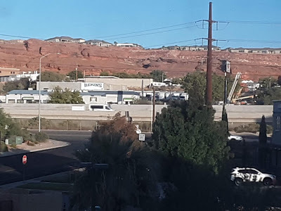There were also the usual Mormonlandia sights: farmland, cattle, little towns. As we got closer to St. George more and more of the buildings looked brand new, and pre-fab. New freeways were under construction. By the time we reached St. George it looked like a freshly-printed Mars Colony patterned after California’s urban sprawl. All the usual corporate franchises that you would find anywhere in America were present. You could parachute consumers from across the USA there and they would find themselves surrounded by the familiar.