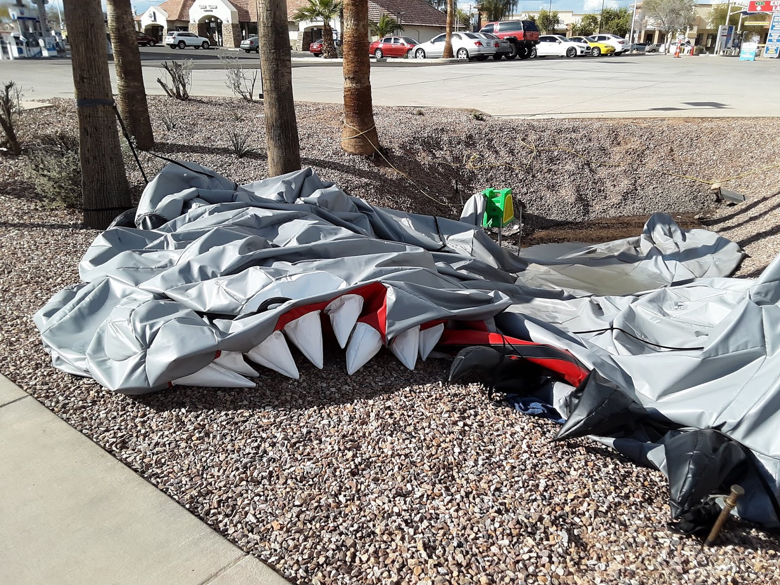 A week later, the dinosaur was deflated, a pile of rumpled fabric with teeth and claws.